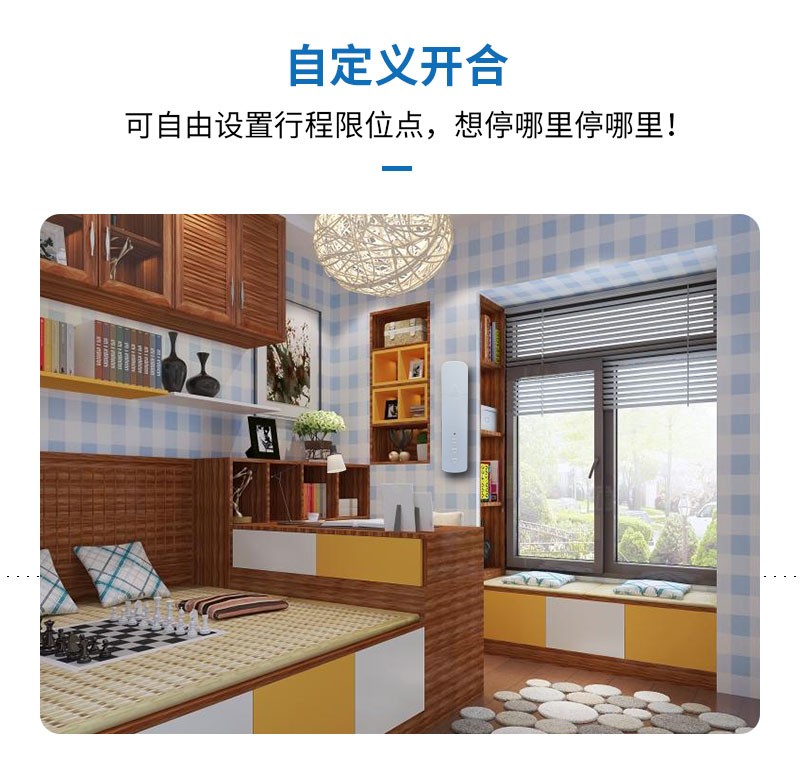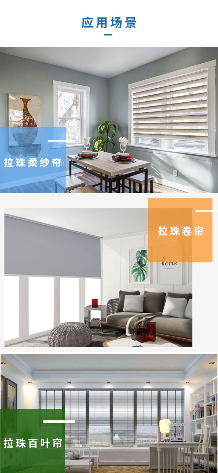 此產(chǎn)品適用于拉珠卷簾,可以把傳統(tǒng)的拉珠卷簾改變?yōu)橹悄茈妱?dòng)窗簾,安裝簡單,操作方便。安裝后可通過遙控器、語音、手機(jī)APP等控制窗簾升降。